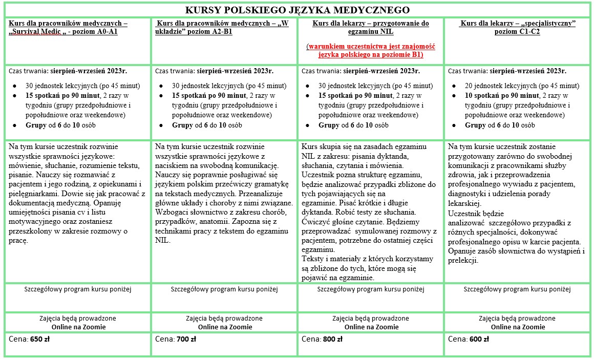 w odpowiedzi na ogromne zainteresowanie nauką języka polskiego wyrażane przez lekarzy, pielęgniarki i ratowników medycznych ze wschodu, którzy chcą lepiej przygotować się do pracy w zawodzie medycznym w Polsce, opracowaliśmy dla Państwa kursy języka polskiego medycznego na różnych poziomach nauczania.